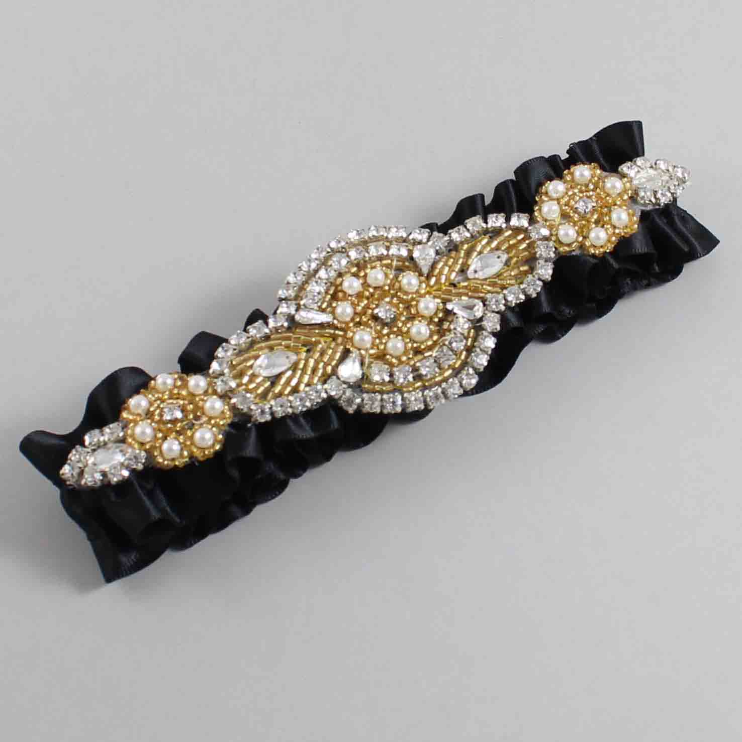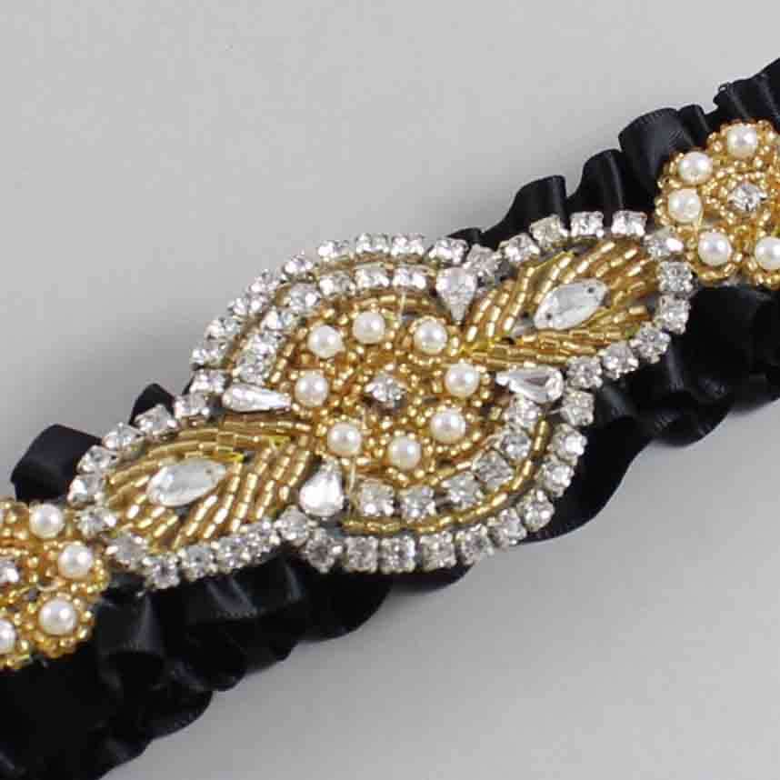 Black Satin with Gold Wedding Garter / Black Wedding Garters / Charlotte #01-A05-(123-123)-Gold