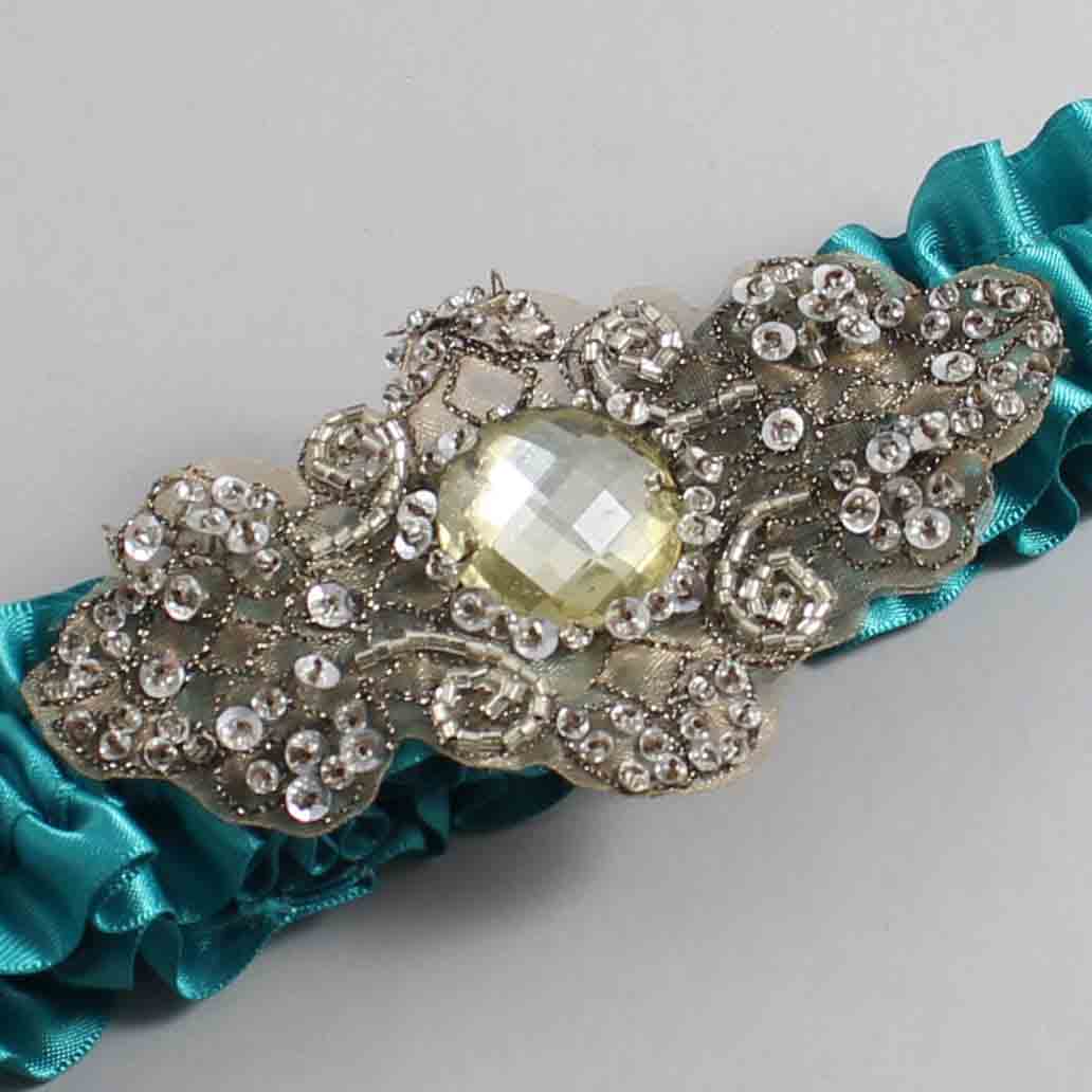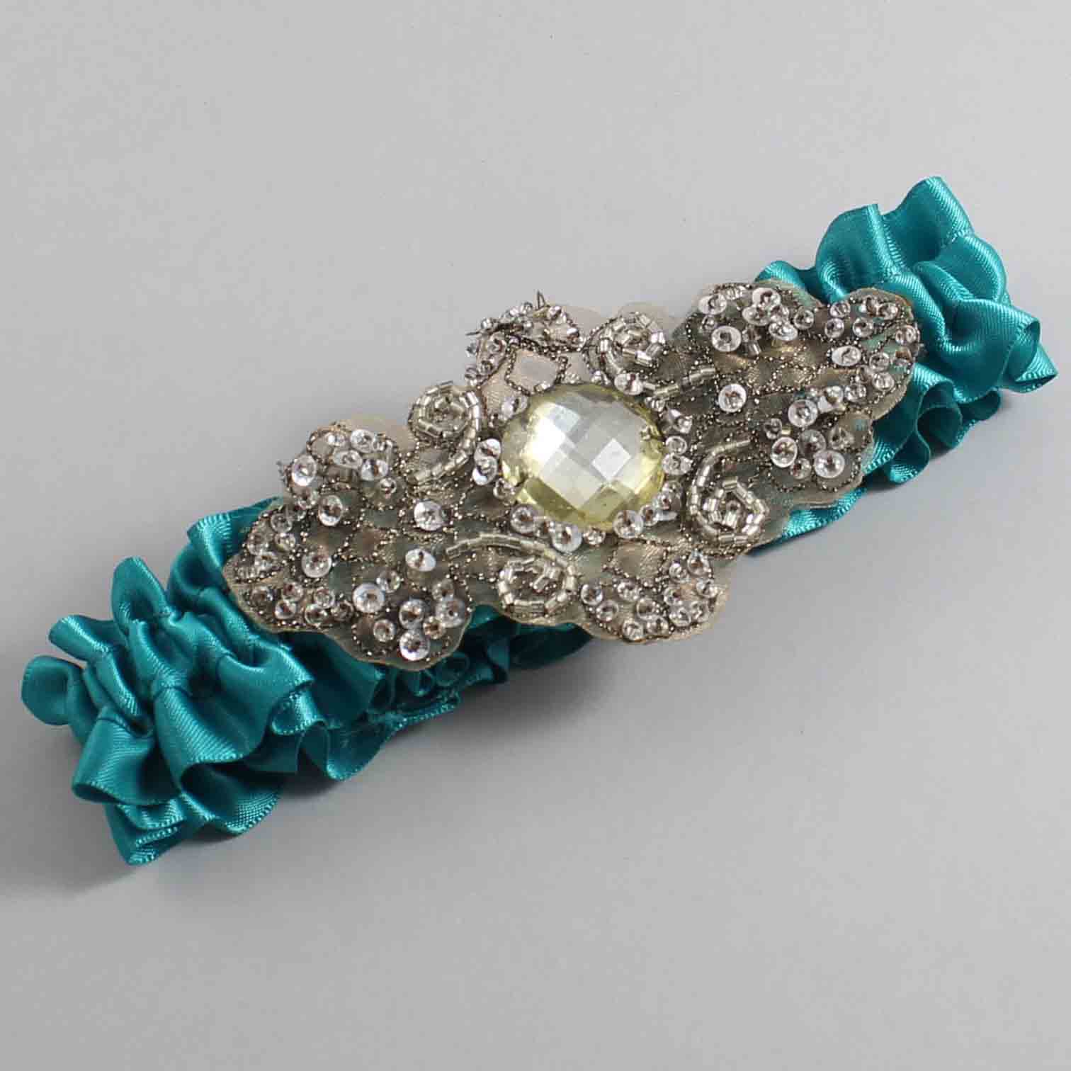 Jade Satin with Brown Wedding Garter / Teal Wedding Garters / Bijou # 01-A01-(346-346)-Antique