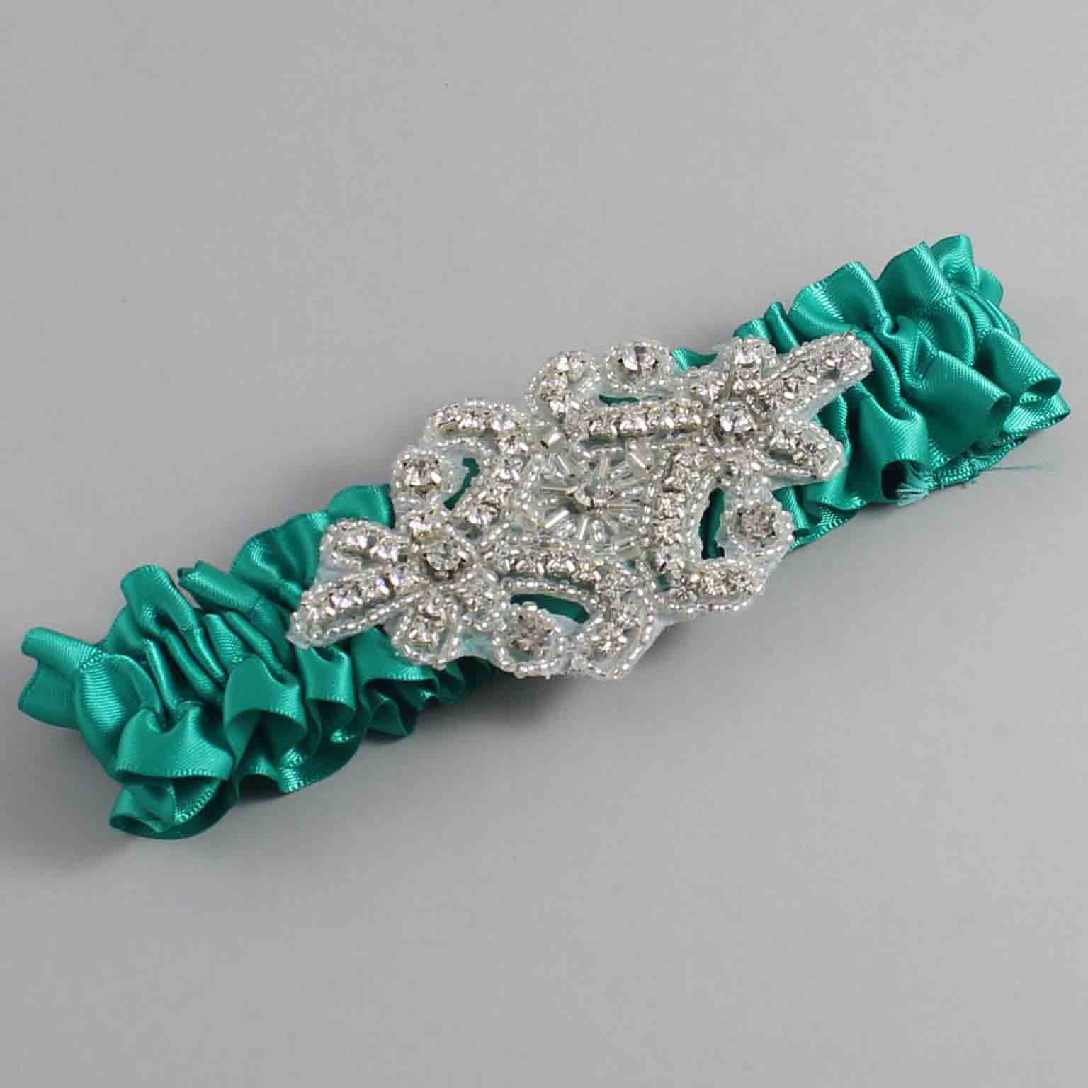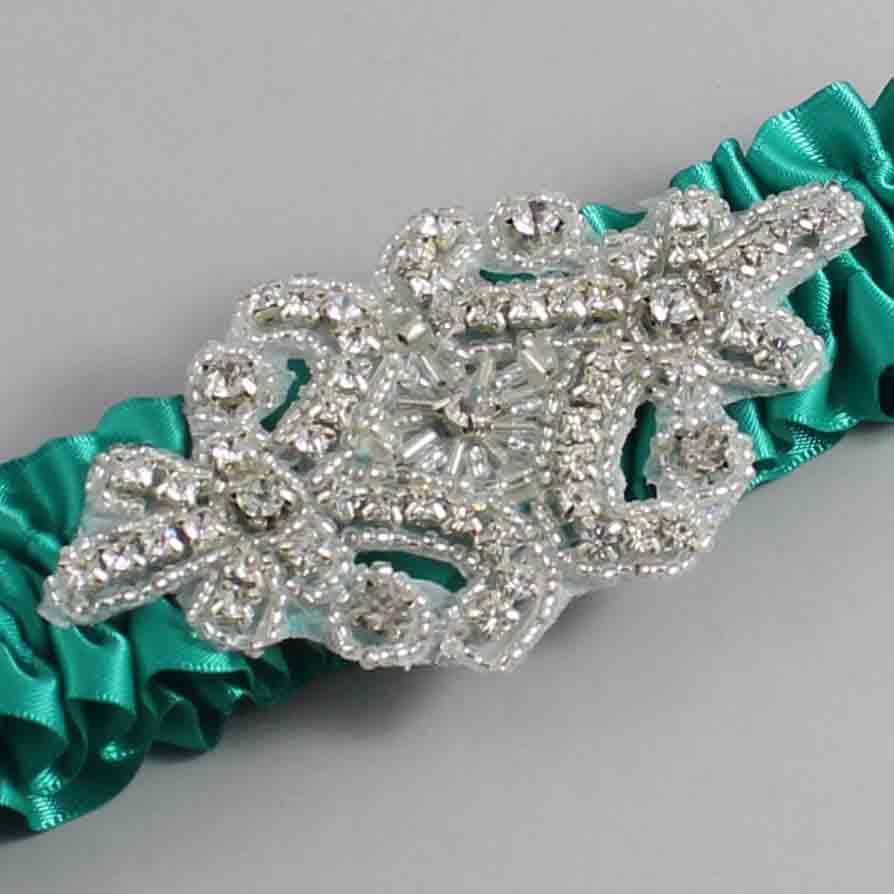Parrot Green Satin Wedding Garter / Solid Teal Wedding Garters / Heather #01-A07-(583-583)-Silver