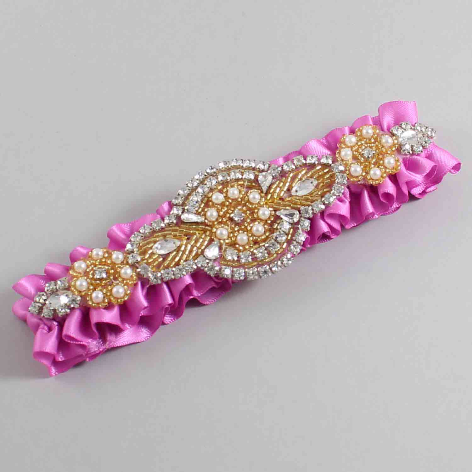 Home » Shop » Shop by Color » Shop by Satin Color » Rose Bloom Wedding Garters 182 » Rose Bloom Satin with Gold Wedding Garter / Pink Wedding Garters / Charlotte # (182-182)-01-A05-Gold