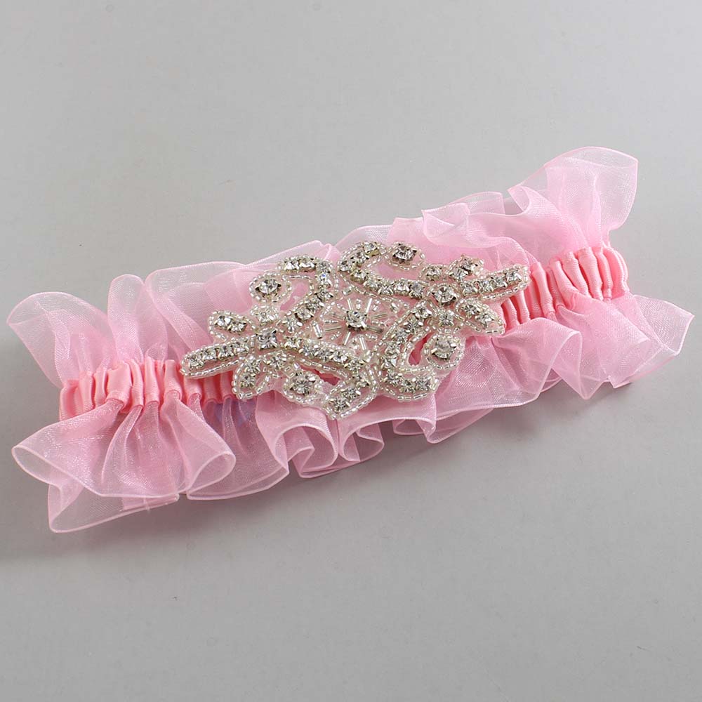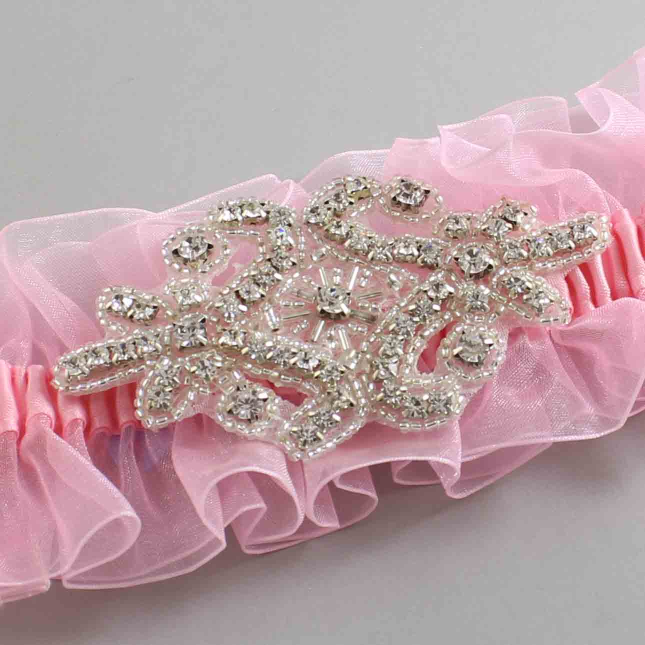 Solid Pink Organza Wedding Garter / Solid Pink Wedding Garters / Heather # (Pink-156-156)-13-A07-Silver
