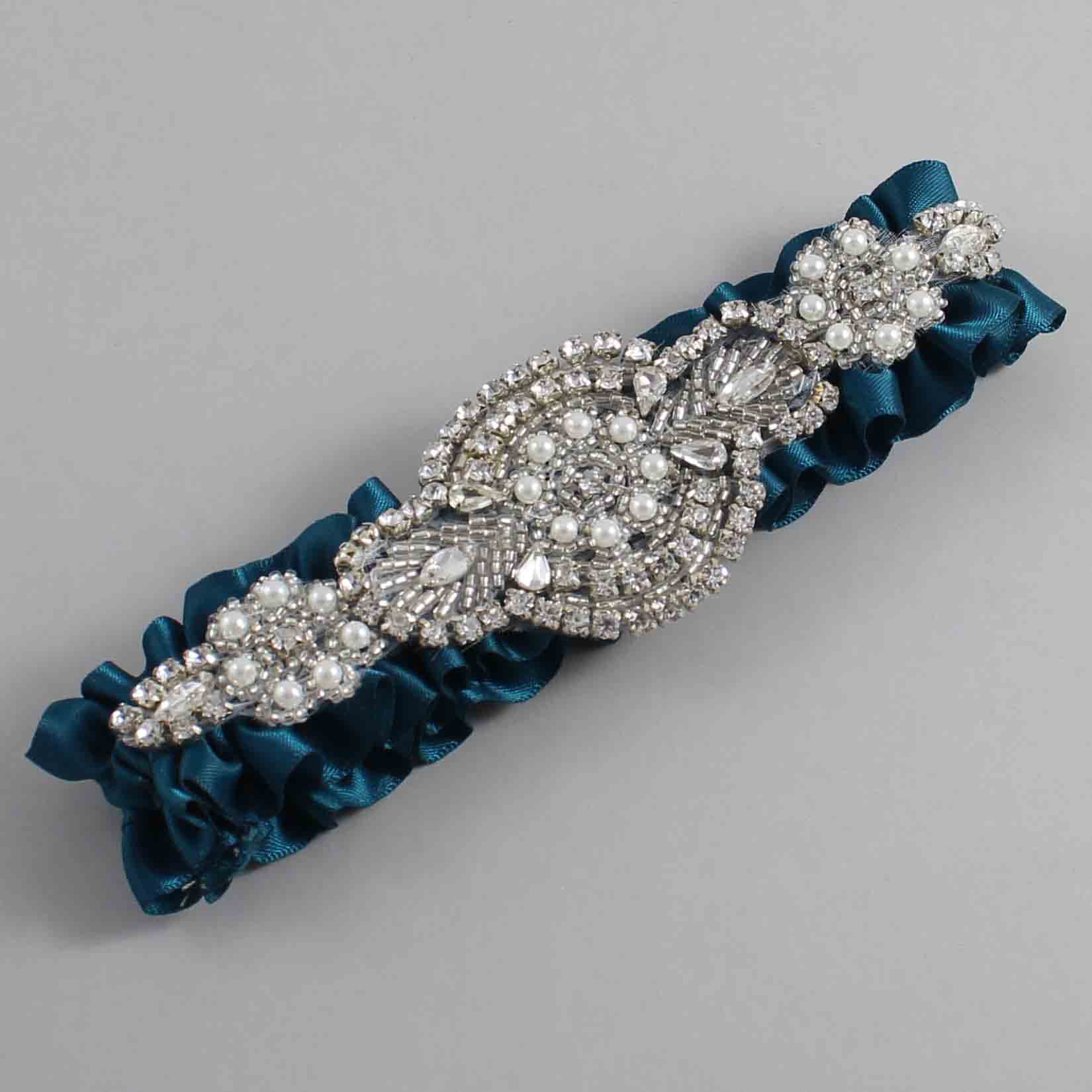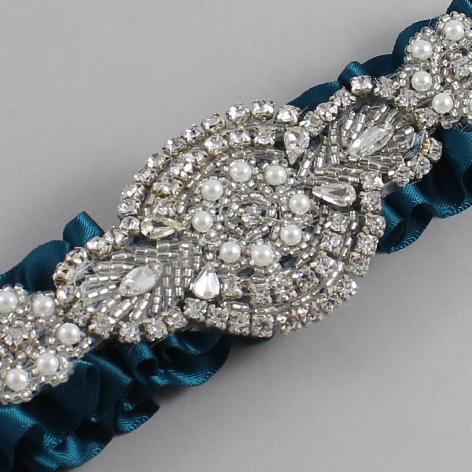 Teal Satin Wedding Garter / Solid Teal Wedding Garters / Charlotte # (347-347)-01-A06-Silver
