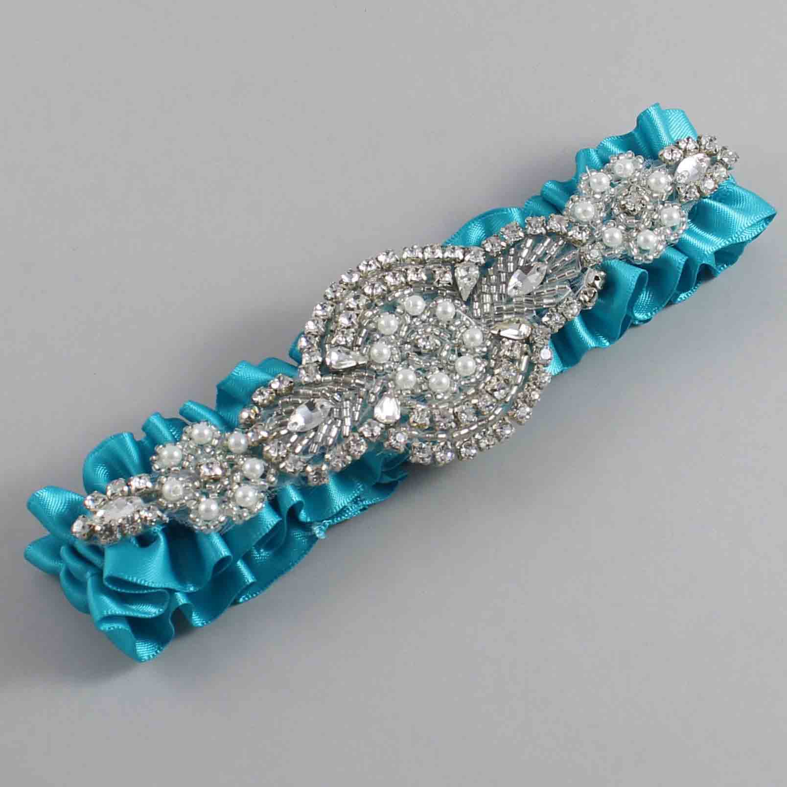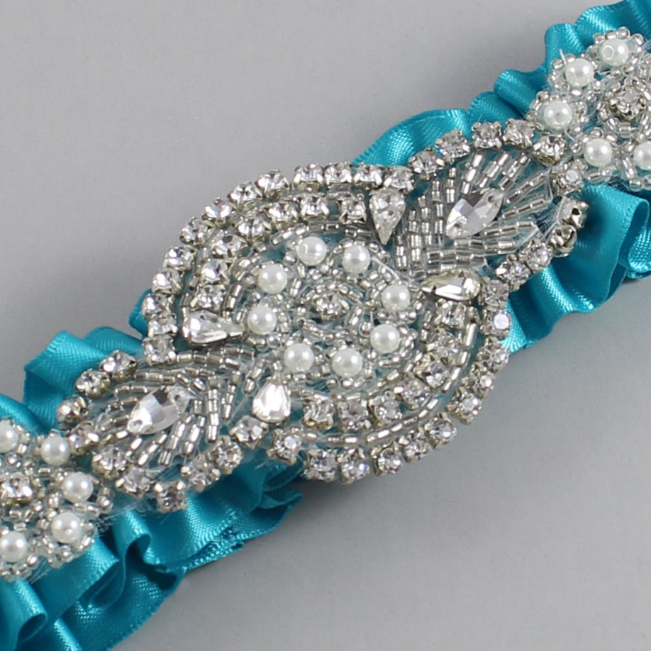 Tornado Blue Satin Wedding Garter / Solid Teal Wedding Garters / Charlotte #01-A06-(344-344)-Silver