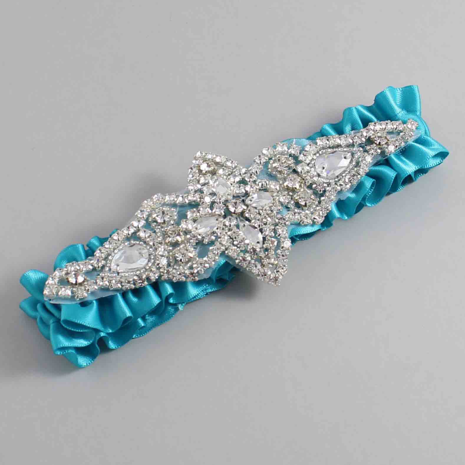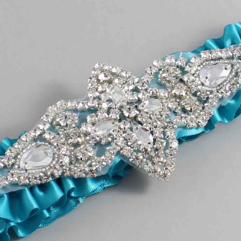 Tornado Blue Satin Wedding Garter / Solid Teal Wedding Garters / Lorine #01-A09-(344-344)-Silver