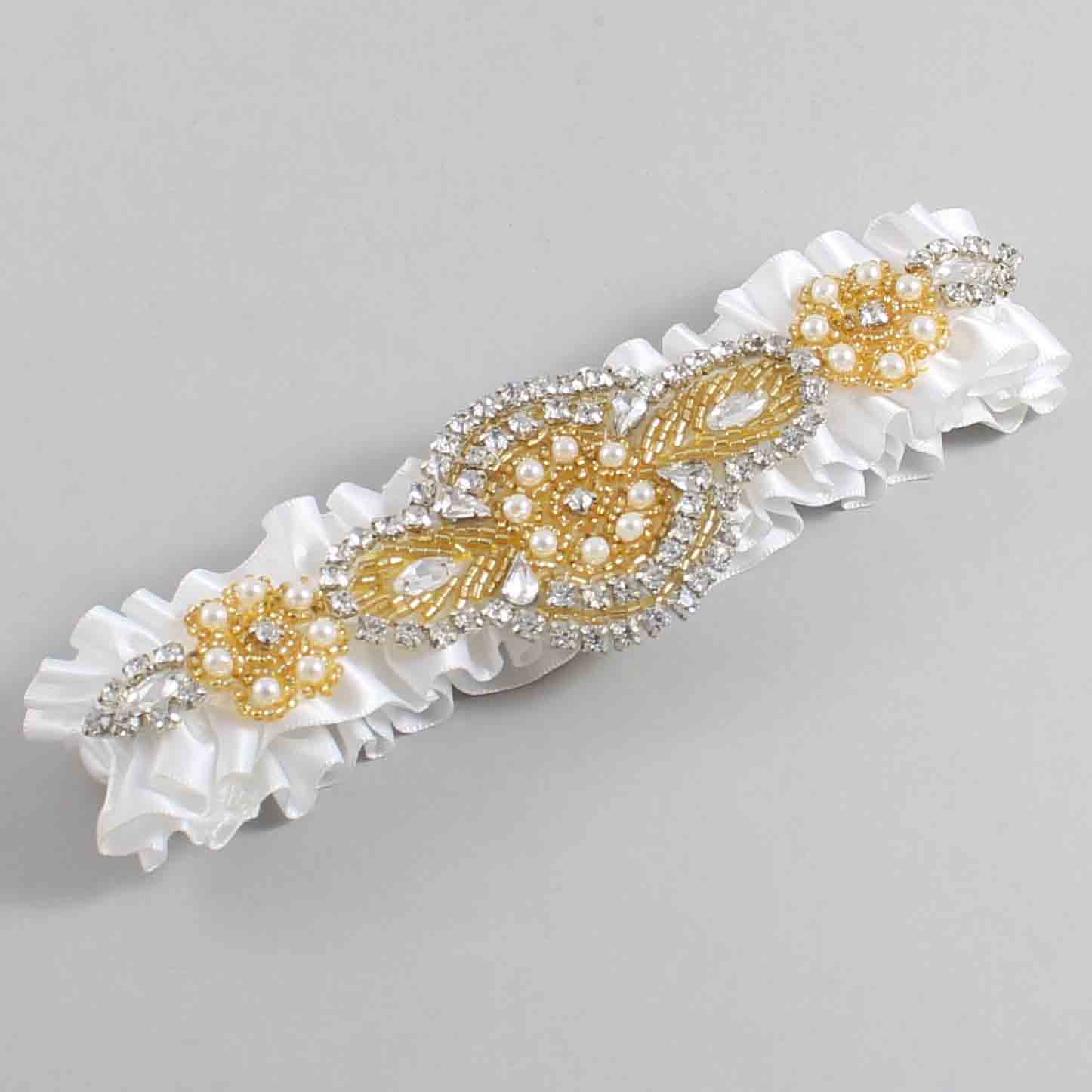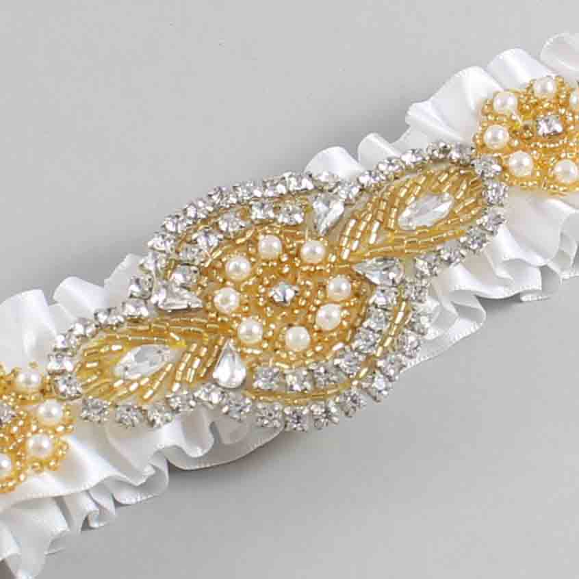 White Satin with Gold Wedding Garter / White Wedding Garters / Charlotte #01-A05-(112-112)-Gold